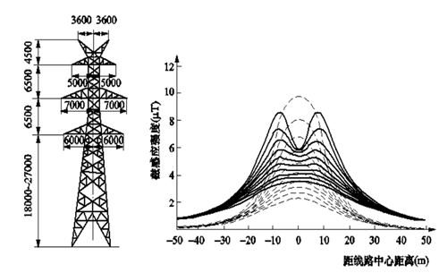 應(yīng)注意到,線路周?chē)臻g的工頻磁感應(yīng)強(qiáng)度與線路電流成正比。隨著單回線路輸電容量的增大,500kV同塔多回輸電線路已采用分裂數(shù)更多、截面更大的導(dǎo)線(如6×630mm2導(dǎo)線),每回線路電流可高達(dá)2000~3000A。此時(shí),線路下方工頻磁感應(yīng)強(qiáng)度*大值可能高達(dá)20~30μT。但即使對(duì)多分裂、大截面、走廊內(nèi)線路高度密集的同塔多回路輸電線路,其下方的工頻磁感應(yīng)強(qiáng)度*大值仍遠(yuǎn)低于環(huán)境影響評(píng)價(jià)標(biāo)準(zhǔn)限值(100μT)。由圖1、圖2計(jì)算實(shí)例可見(jiàn),在距線路中心50~100m以上距離處,來(lái)自電力線路的工頻磁場(chǎng)水平已與當(dāng)?shù)厣瞽h(huán)境中的背景水平相當(dāng)。