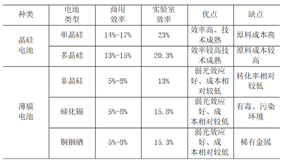 太陽能電池主要有以下幾種類型:?jiǎn)尉Ч杼柲茈姵亍⒍嗑Ч杼柲茈姵?、非晶硅太陽能電池、碲化鎘電池、銅銦硒電池等。