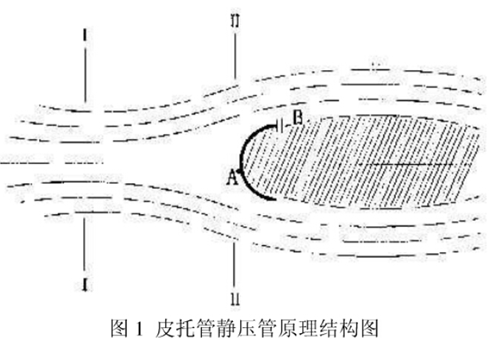 皮托管的測(cè)量原理是基于伯努利方程在空氣中應(yīng)用的一個(gè)實(shí)例,如圖1所示。當(dāng)理想流體均勻的平行流向靜止物體時(shí),設(shè)想其中一條撞在物體上(即圖1中的A點(diǎn)),在此處流體發(fā)生分岔,A點(diǎn)成為滯止或駐點(diǎn),A的流速為零,V-A=0。