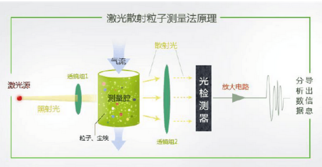 激光光散射粉塵儀通過采氣泵將待測(cè)氣溶膠吸入檢測(cè)艙,待測(cè)氣溶膠在分支處分流成為兩部分,一部分經(jīng)過一個(gè)高效過濾器后被過濾為干凈的空氣,作為保護(hù)鞘氣來保護(hù)傳感器室的元器件不受待測(cè)氣體污染。另一部分氣溶膠,作為待測(cè)樣品直接進(jìn)入傳感器室。 傳感器室中,主要元器件為激光二極管、透鏡組和光電檢測(cè)器。檢測(cè)時(shí),首先由激光二極管發(fā)出的激光,通過透鏡組形成一個(gè)薄層面光源。薄層光照射在流經(jīng)傳感器室的待測(cè)氣溶膠時(shí),會(huì)產(chǎn)生散射,通過光電探測(cè)器來檢測(cè)光的散射光強(qiáng)。光電探測(cè)器受光照之后產(chǎn)生電信號(hào),正比于氣溶膠的質(zhì)量濃度。然后乘以電壓校準(zhǔn)系數(shù),這個(gè)系數(shù)通過測(cè)定特定濃度的氣溶膠來得到。