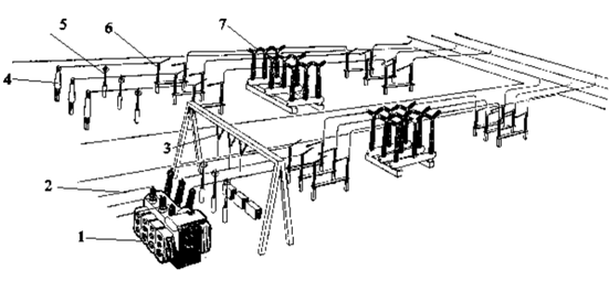圖1 1—變壓器;2—導線;3—絕緣子;4—互感器;5—避雷器;6—隔離開關(guān);7—斷路器