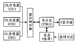 前端傳感器輸出的數(shù)字信號(hào),以串口方式與STM32進(jìn)行通訊,此儀器設(shè)計(jì)三通道采集,利用繼電器電路對(duì)傳感器通道進(jìn)行選擇,STM32將濃度值顯示在液晶屏上,液晶屏帶有觸摸功能,通過(guò)編寫液晶顯示界面,調(diào)用相關(guān)按鍵程序,選擇傳感器通道以及保存為U盤數(shù)據(jù)等功能??驁D如圖1所示。