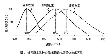 當(dāng)人們做這個實驗的時候,有個驚人的發(fā)現(xiàn),那*是:發(fā)現(xiàn)了視網(wǎng)膜上不同的視錐細胞對光譜存在著三種不同的吸收,因而*出現(xiàn)了三種不同的吸收曲線。下面的曲線圖*是其一。只不過是,該圖把三種不同的視錐細胞的光譜吸收曲線畫在同一張圖上了(該圖選自劉家琦,李鳳嗚主編的《實用眼科學(xué)》第二版.北京人民衛(wèi)生出版社,1999年版.第50頁)。這張圖的意思是,用400nm到700nm的色光去單獨照射每個視錐細胞時,其結(jié)果是:反射回來的光的數(shù)量并不是一樣多,而是有三種。因而,*繪制出了三種不同的吸收曲線圖。并且,這三條曲線各自占據(jù)了光譜中的藍區(qū)、綠區(qū)、紅區(qū)的不同位置。因此人們便依據(jù)這一點得出了,視網(wǎng)膜接受外界光線刺激時,可以產(chǎn)生出紅、綠、藍三種原色的觀點。